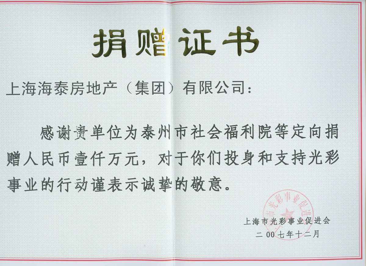 海泰地产捐款1000万元人民币筹建泰州市社会福利院
